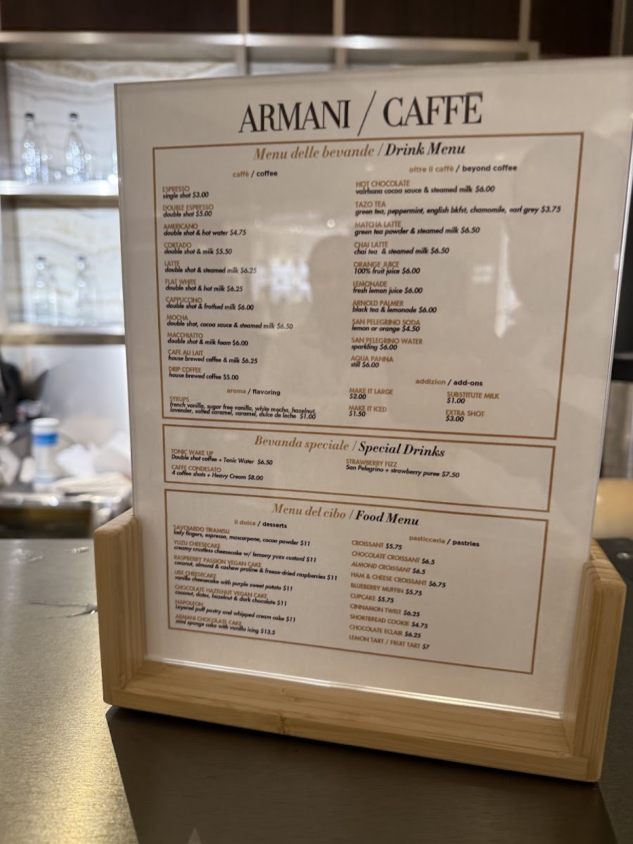 The moment you arrive, you are greeted by the inviting aromas of freshly brewed coffee and baked goods. Whether you're in the mood for a quick coffee break or a leisurely read over delectable pastries, ARMANI CAFFE makes each visit special. According to customers, the café is a welcome respite during shopping excursions. As Magali Gutierrez notes, it's an excellent spot for a quick coffee with a soothing chocolate croissant that provides a delightful balance of richness and sweetness.